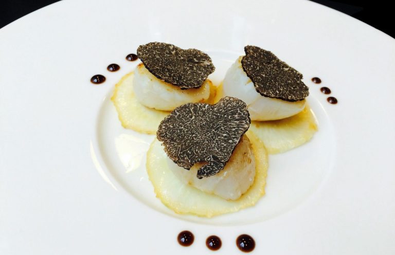 Noix de Saint-Jacques snackées, émulsion légère à la truffe noire